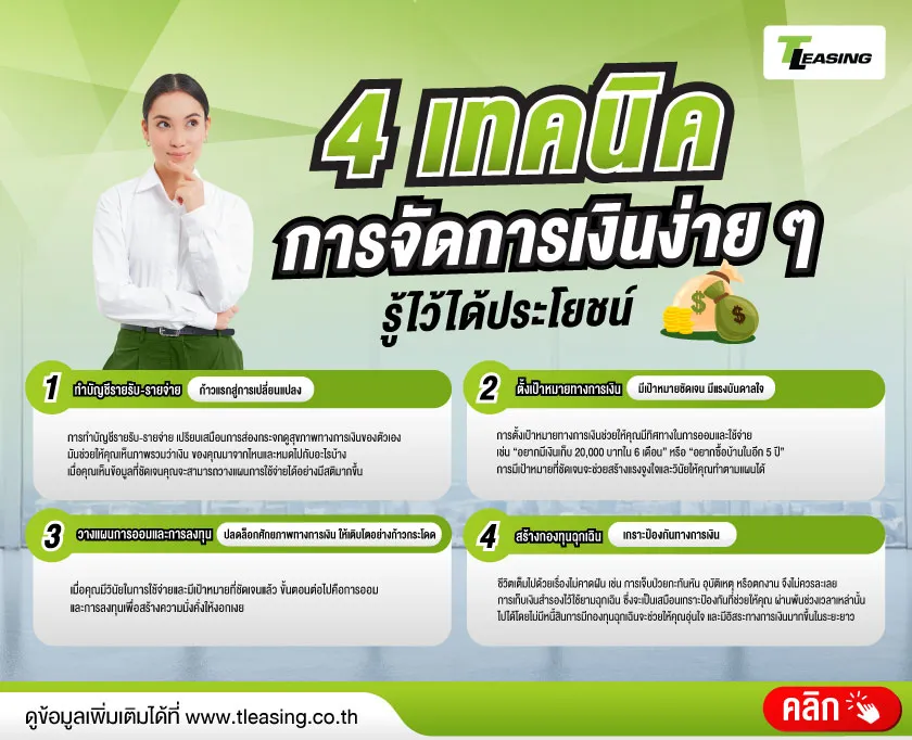 การจัดการเงินไม่ใช่เรื่องยากอย่างที่คิด เพียงแค่เริ่มต้นด้วย 4 เทคนิคง่าย ๆ เหล่านี้ คุณก็สามารถวางรากฐานเพื่ออนาคตทางการเงินที่มั่นคงได้แล้ว ลองนำไปปรับใช้และเริ่มต้นตั้งแต่วันนี้เลย